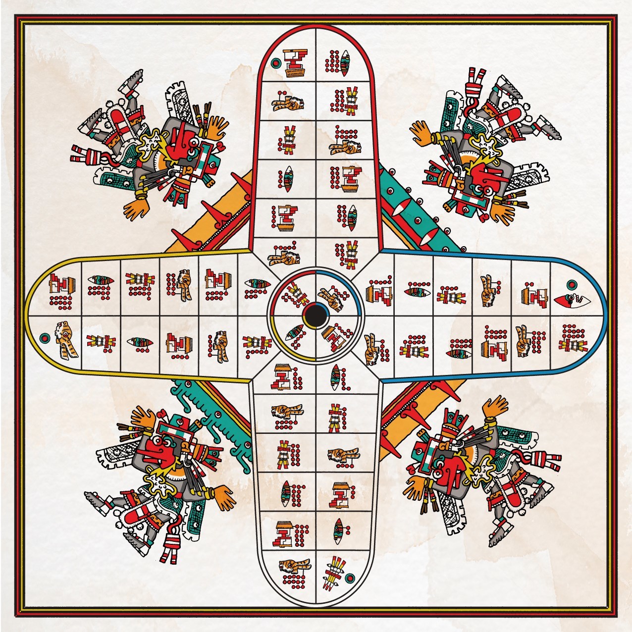 The Patoli is played on a board with a diagonal-shaped cross, divided in 52 boxes that represent the Mayan calendar wheel (related to “Fuego Nuevo” – New Fire), and the “Huehuetiliztli" (104 year cycle). Black beans with a hole drilled in one side were used as dice; this is why patolli is sometimes called the bean game. The aim is to complete a full lap of the board with their pieces before the other player.