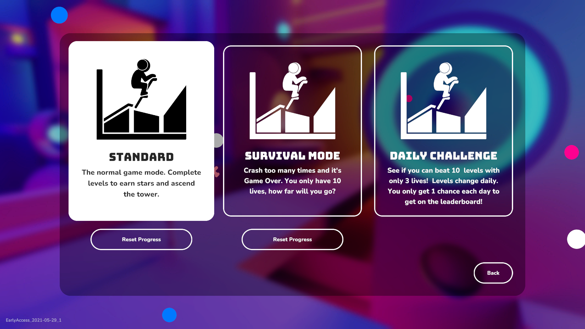 This week I started working on a new way to play PogoChamp: Survival Mode. This mode will take you through the levels of the main game, but instead of trying to complete levels as quickly as possible, you need to complete them without crashing. The leaderboard will show best completion times, or number of levels completed if you haven't completed it. There will also be a daily challenge mode, which is like a mini version of the survival mode, featuring a randomized set of 10 levels. There's still lots of work to do before these modes are ready to be released, but they have actually come together pretty quickly and without many major problems.