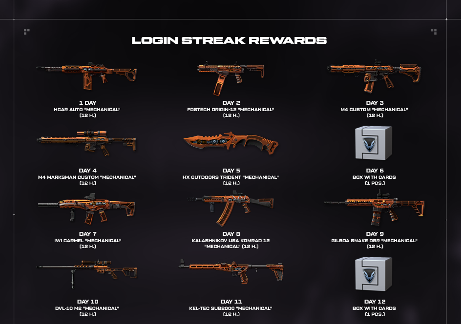 Log into the game every day and get a temporary reward — cool weapons from the "Mechanical" series and boxes with cards fro crafting "The Big Score" arms. A gift every day.