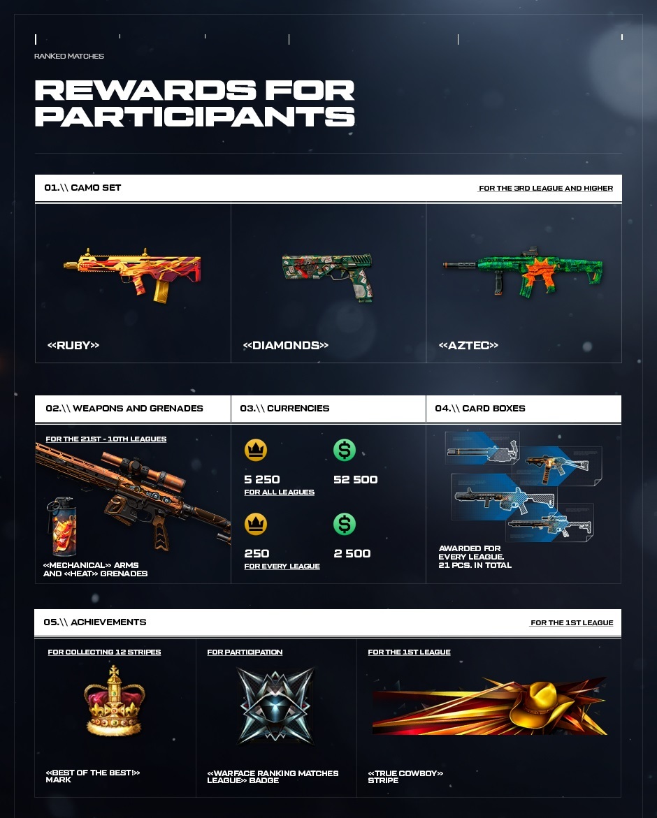 The unique stripe "True Cowboy" and the "Warface Ranking Matches League" badge will be given immediately upon reaching the 1st and the 21st leagues respectively and not after the end of the season as it used to be.