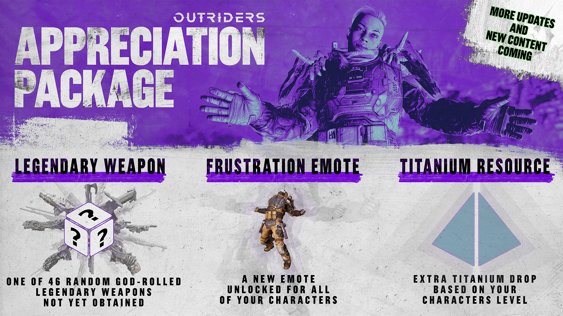The Community Appreciation Package is here and everyone who has played Outriders to-date is eligible! Your most experienced character has been granted: