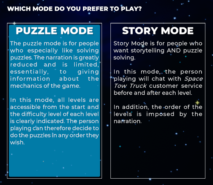 The puzzle mode is for people who especially like solving puzzles. The narration is greatly reduced and is limited, essentially, to giving information about the mechanics of the game.