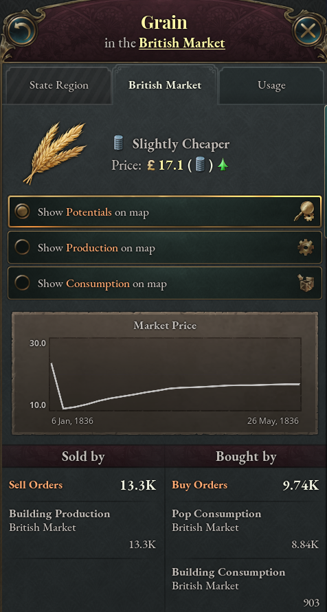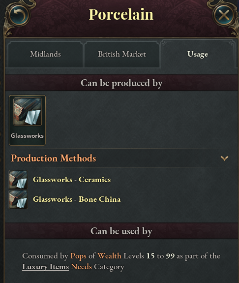 Luxury Goods are the things that Pops do not necessarily need but definitely want, such as fine foods, luxury drinks like Tea and Coffee, or fine clothes made from chinese silk. Luxuries tend to be more profitable to produce than Staple Goods, but depend on having a customer base with money - a poor factory worker isn’t going to be buying a whole lot of mahogany cabinets.