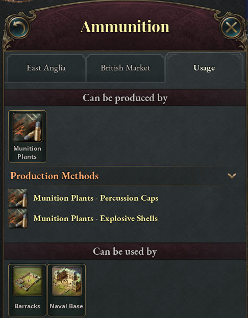Military Goods are goods such as Small Arms, Ammunition and Warships that are used by military buildings to arm and supply the armies and navies of the 19th century nations. The more technologically advanced the army or navy, the more complex (and expensive!) Military Goods they will need.