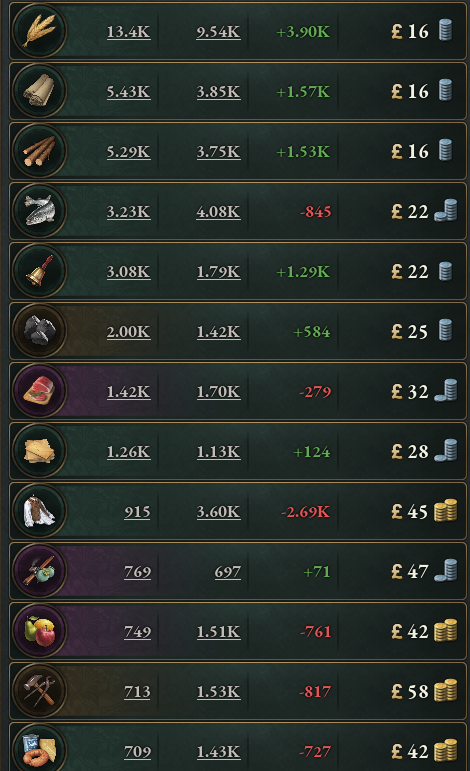 Fundamentally, a unit of Goods represent a quantity of a certain type of natural resource, manufactured good or intangible service and come attached with a price tag. This price varies both in base (a single unit of Tanks is pricier than a single unit of Fabric) and in actual market value, as the prices of Goods change depending on supply and demand.