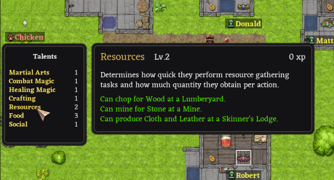 Talents have been added to introduce variations in Villager capabilities. One Villager may have a high Talent level in Combat Arts, unlocking higher tier combat classes and providing it with combat-related stat buffs. Another Villager may have a high Talent level in Resources, which may expand the type of Resources it can gather.