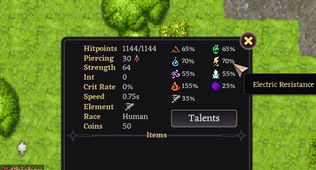 We've already introduced Piercing and Resistances before but Villagers did not yet have any means of improving theirs until now. To recap, Resistances reduce damage to that specific type of element. It also gives a chance of completely resisting Spell effects (ex: Seize Villager is a Physical-based Ability so a Villager with high Physical Resistance may resist it). Meanwhile, Piercing negates Resistances.