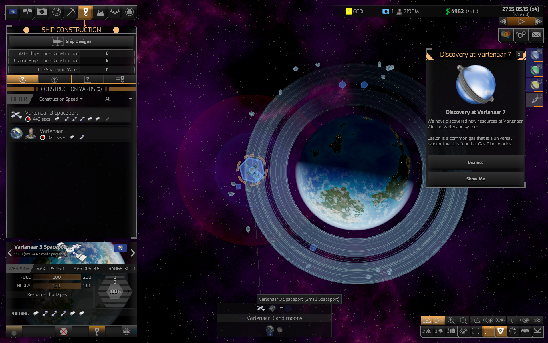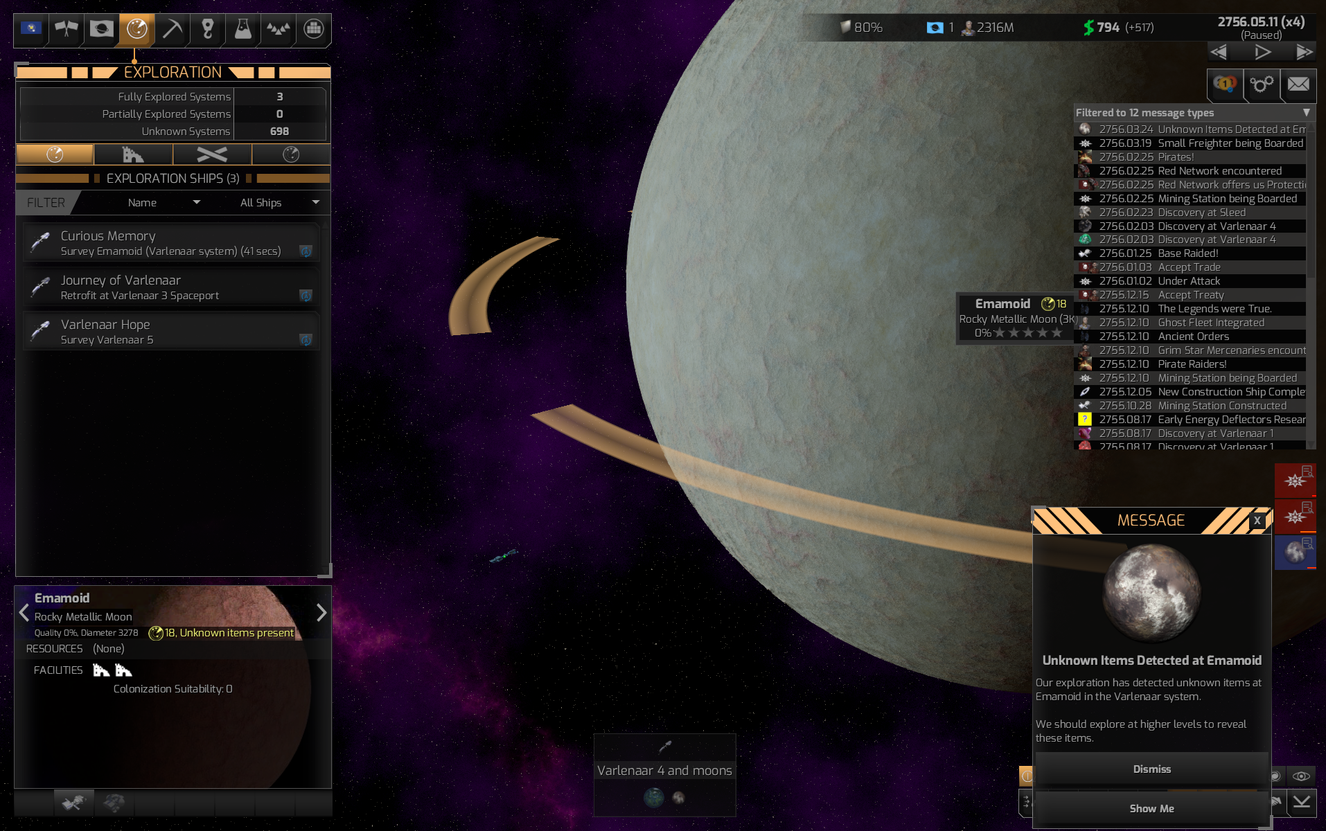 In the view above, you can see that for the planet and moon on the right side of the system, I have found two ruins that are not yet fully explored. I also know of two available resources that could be mined and the exploration indicator in yellow is tellng me the current exploration level and that exploration there is not yet completed. The middle planetary group just has four resources. The middle left has a star showing that it’s our capitol planet, what its population is, what its happiness is, that it has the capability for construction (both due to the planet and the spaceport) and that it is a location that can refuel ships. Under that, it shows an explored ruin, the various explored resources and that we have 120 Troop Strength there.