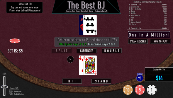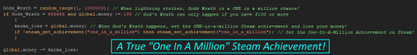 With this update, every time you get bolted, there is also a true one-in-a-million chance that you'll lose all of your money (you need to have a minimum of $100) and if this happens, you'll earn the "God Hates Me" Steam achievement! ...Not only that, but your game screen will PERMANENTLY change to look like this with a "One in A Million" banner on the right side of the screen as well!