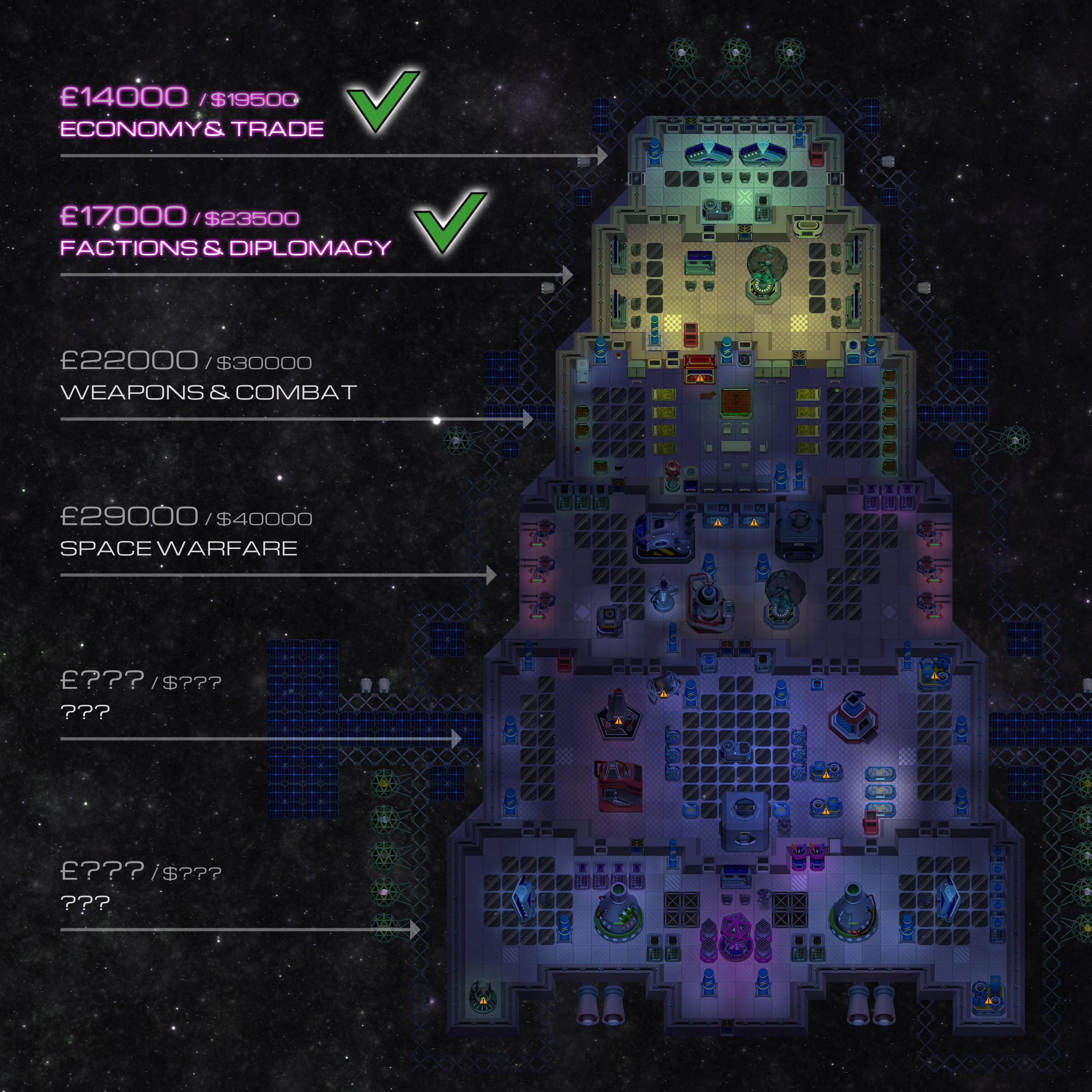 Big thanks to all of you! We have crushed the second Kickstarter stretch goal - Factions & Diplomacy! This means Stardeus universe will be full of life, with other surviving ark ships, pirates, alien and AI factions. That will affect the economy and trade (which I already started working on), since faction relationships will have an effect on prices of goods.