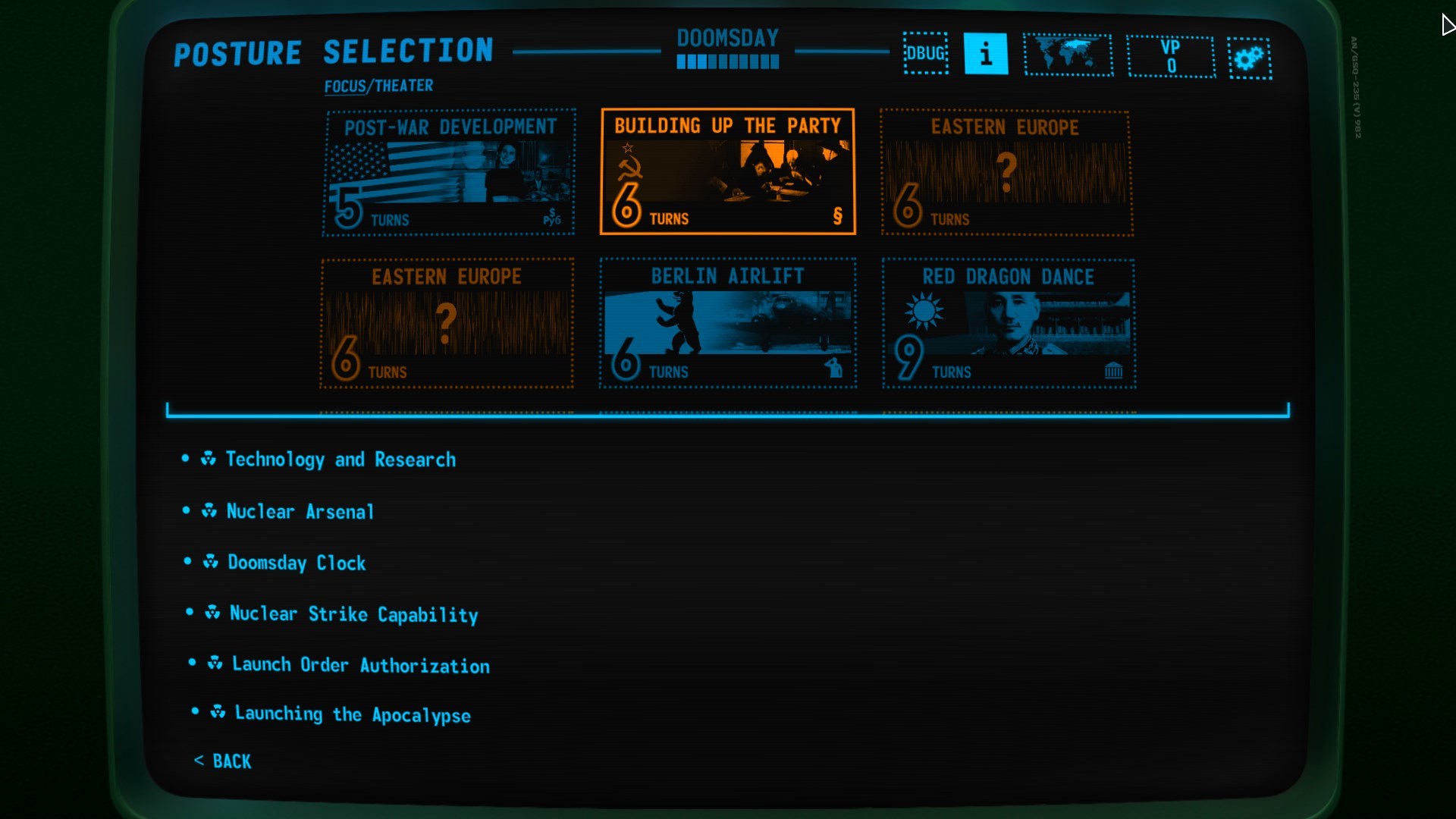 Let's look at getting to one of my favorite entries, Nuclear Weapons. You choose the option “Developing Technologies and Research” it's the one with the cute beaker icon. Then drill down to “Nuclear Weapons” and you will see all the options for items in your terminal associated with nukes.