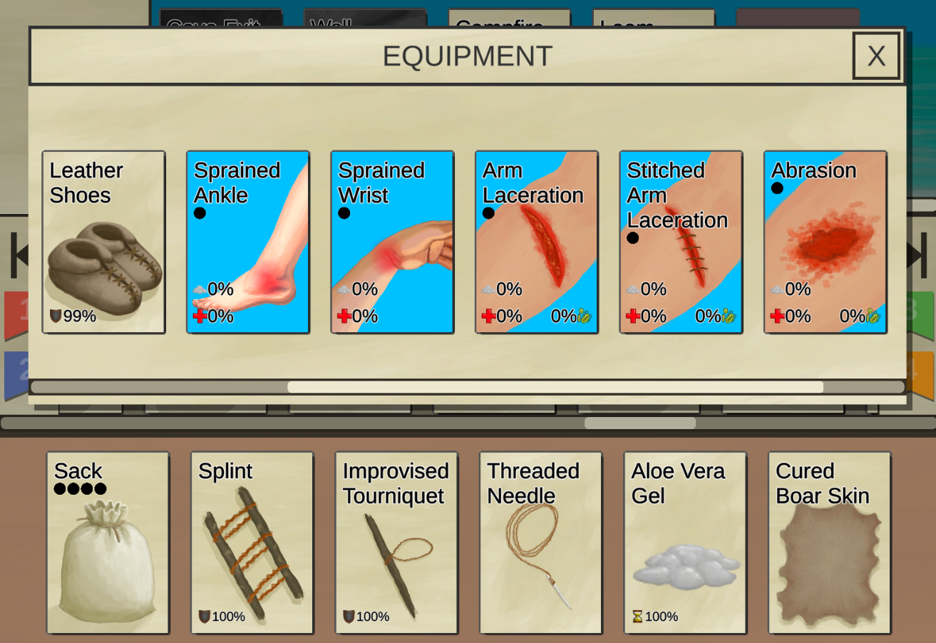 Each open wound now has its own rate of infection and has to be washed separately as well as treated with dressings, splints and tourniquets depending on their type. Wounds can now also have Aloe Vera applied to them to help them heal, and open lacerations can be stitched up with a threaded needle. We've also added a splint to treat sprains and fractures and a new simpler, but worse, tourniquet that does not require cloth.