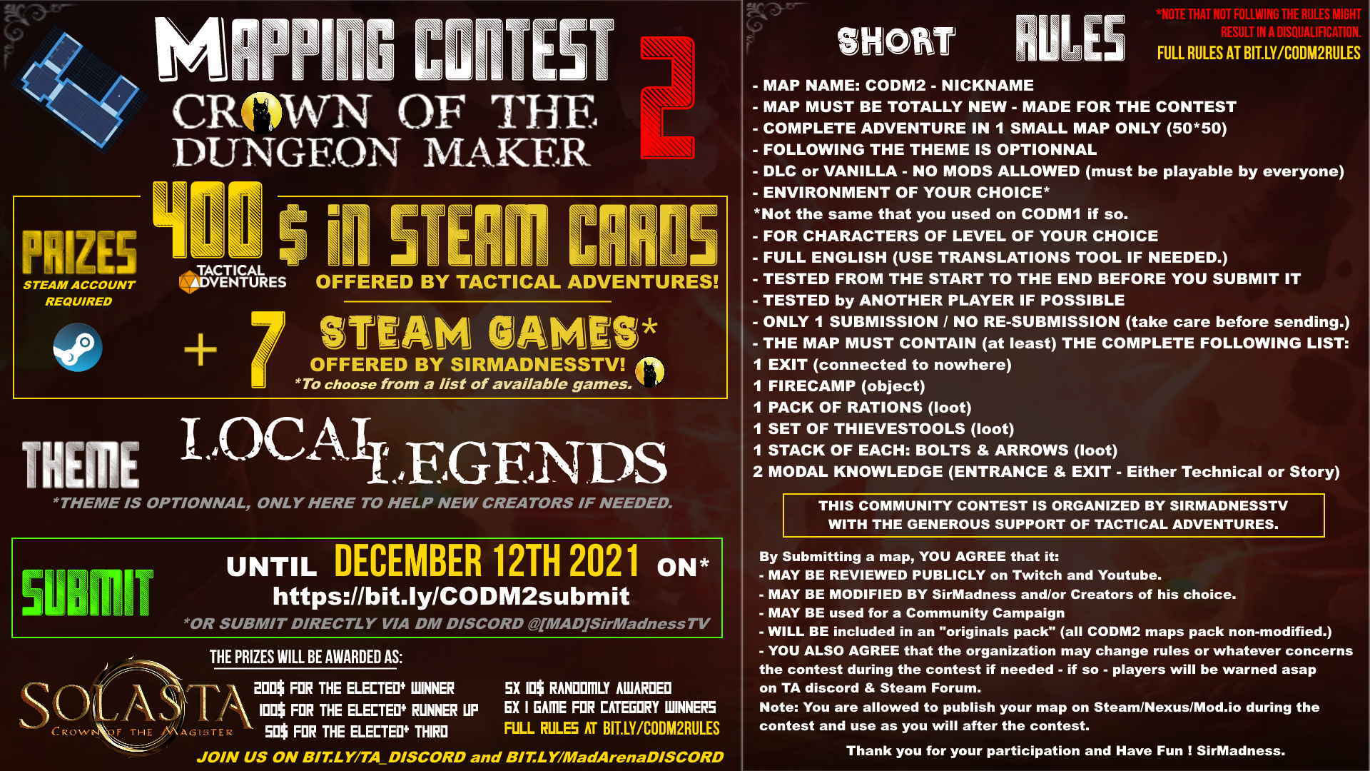 If you have a creative touch, submit your Custom Map in SirMadness's Dungeon Maker contest before Dec 12th (rules: {LINK REMOVED}https://bit.ly/SolastaDMContest)