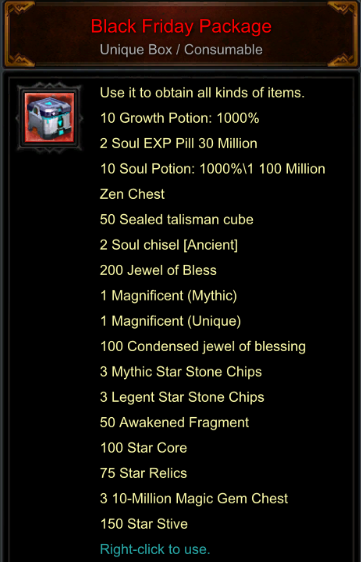 Black Friday gift - Red Imprint (20 pcs) - Shining Red Imprint (10 pcs) - Rapid soul potion 2000% (10 pcs) - Soul Potion 1000% (5 pcs) - 1.5M magic gem chest (10pcs)