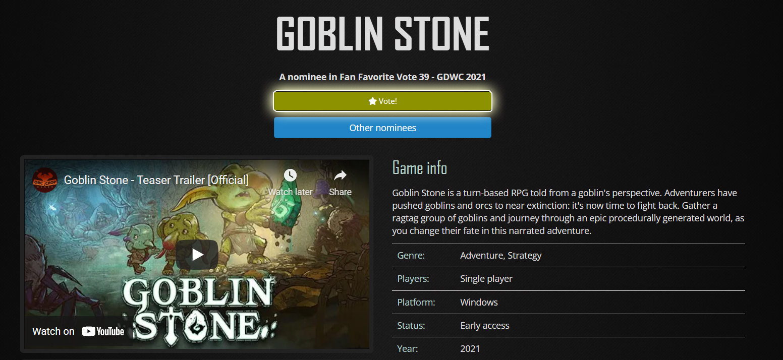 Please don't forget to share this and invite your friends to vote for us too! Remember to use the hashtag #GDWC2021 #goblinstone and tag us and GDWC when posting.