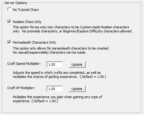 For now there are only a few server options, however the framework now exists to add many more. I mostly wanted to get these main options in so people can make specific server types that fit needs of players who want a more hardcore crowd, or a more casual one.