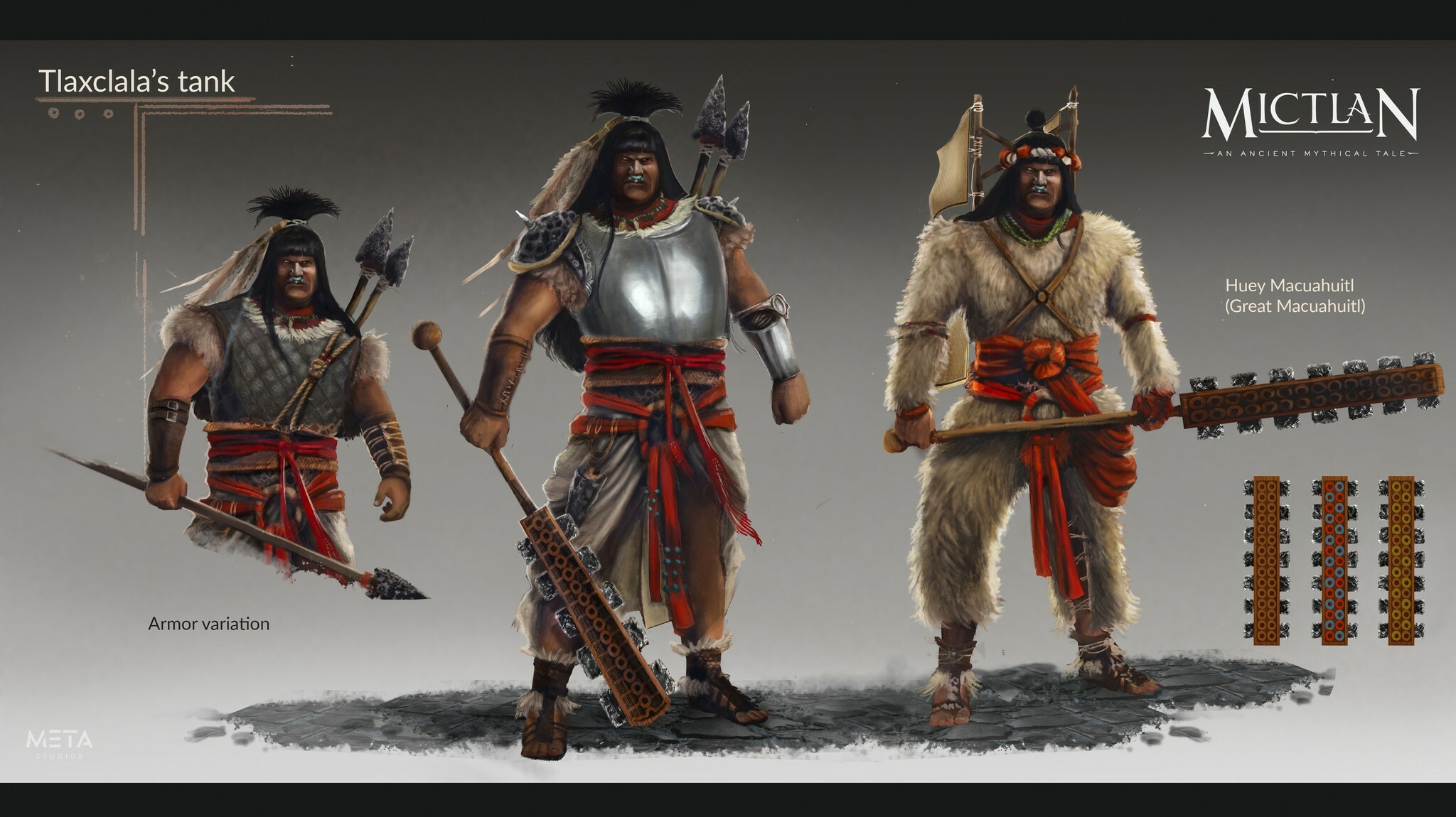In this concept art, you can admire powerful warriors wearing ichcahuipilli, the classic protective armor of the Mesoamerican warriors.