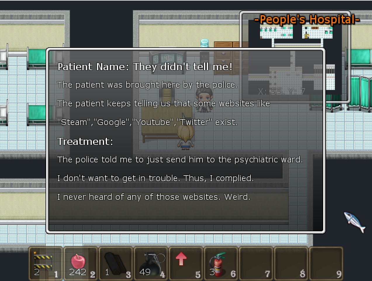 Today's changelog: #########Content############### New item: Monk's Robe. (It may have prefixes. It's the only non-weapon item that may have the merciful prefix for now.) Added the monk's item drop list. (It's short. But, better than nothing.) New item: Dirty Water. (It functions like clean water, but has a slight chance to cause poison. ) Toilets now produce dirty water instead of clean water. Dr. Wang's computer can now interact after you have talked to him for the first time. There are five patients' files. Some of them shall be remembered. Thus, they are in this game.