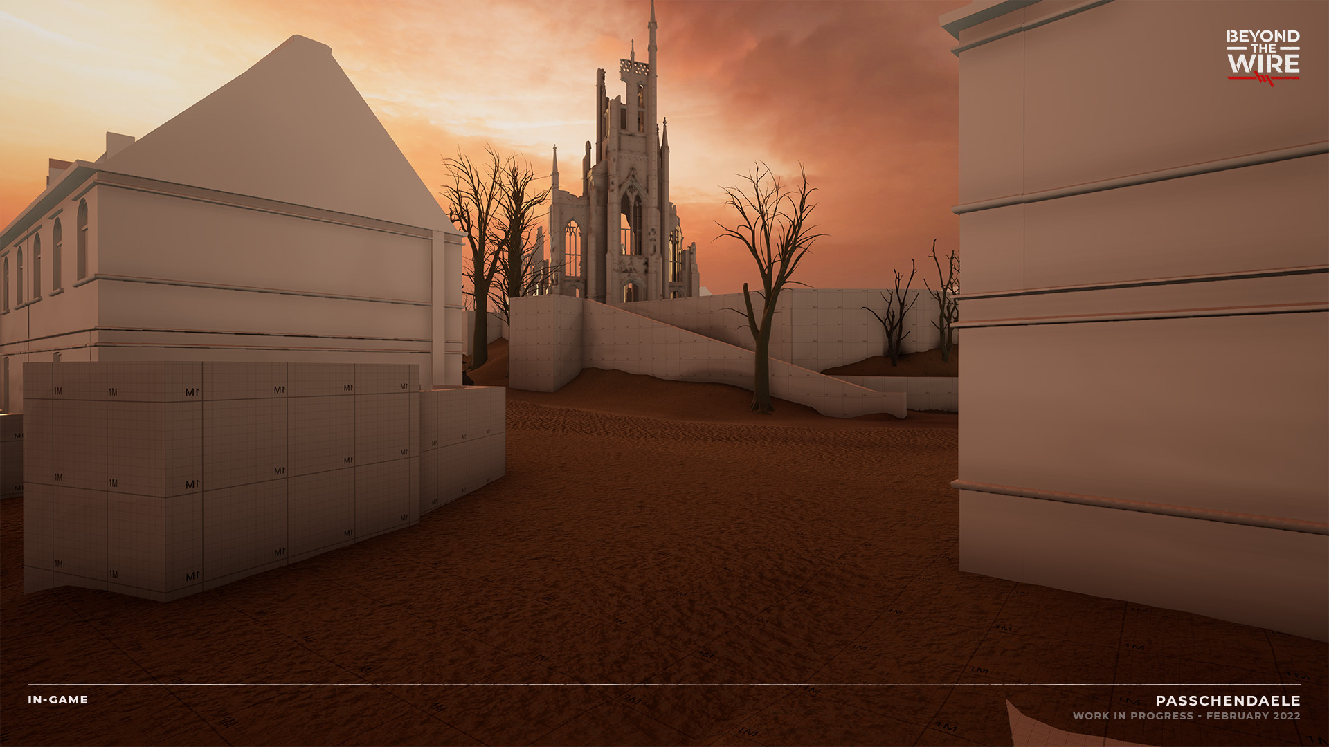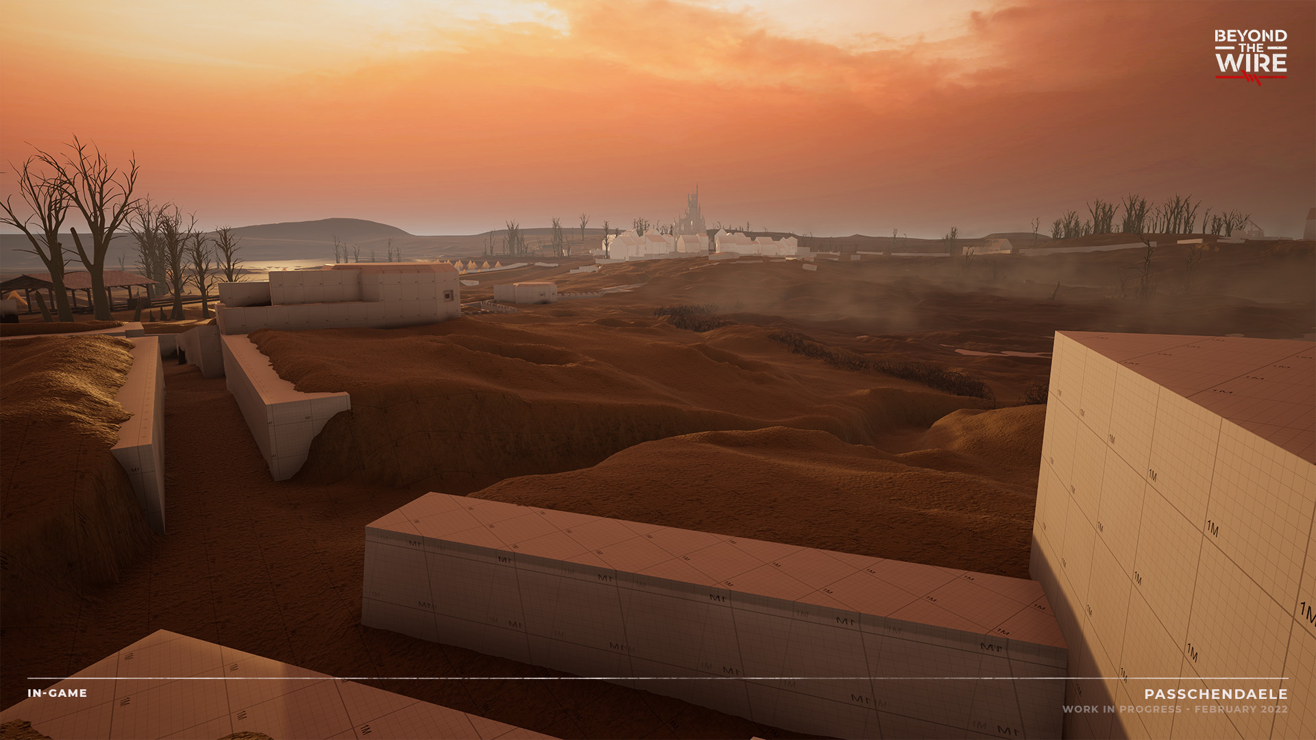 The next field of battle to arrive is Passchendaele and is well underway with the majority of whiteboxing being completed and the environment art team working on new buildings that will add a unique look to this map. As this battlefield will be debuting with tanks, much of the level design focus has been aimed at ensuring satisfying vehicle gameplay while sticking with our direction for brutal infantry combat. Featuring an open, daunting no-man's-land before tight combat spaces in the town and across bunker systems spread across the line. layers will see the first major gameplay diversity arriving with tanks in this latest map. While much of the map layout is complete the team are still world-building and look to create new assets to offer some unique visuals.