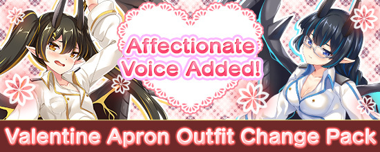 The following items wil be included in each Affectionate Voice Valentine Pack. ・Outfit: Lovey Voice Valentine's Apron ×1 ・Limited Gacha Ticket ×5 ・Weapon Grade + Power ×2 ・Max Durability +500 Ticket ×2 ※Limited Gacha Ticket will be removed in a future update maintenance, so please use the tickets soon after acquisition.