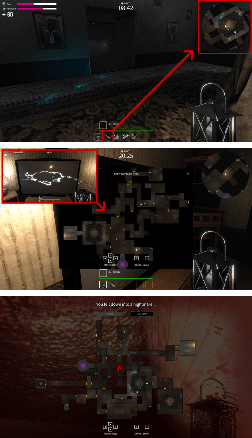 Added the item "Mini Map". - It's on the same shelf that contains the key to the starting room. - Use items to open and close the Mini Map. - If it's in your inventory, you can use other items while the Mini Map is open. - While useful, it will overwhelm your inventory, so it's up to you to use it. - Automatically closes when discarded, but be careful not to lose it as there is only one in the dungeon. - The upper and lower floors are judged, and the close range of the same level can be checked. - The key room will only appear on the map when you enter it. - The girl will only appear on the map when you talk to her, and she will follow you within the area of the Mini Map. - Enemies are not displayed, so you need to be careful, but you can see doors opening and closing, lights, etc., so you can detect danger before it happens.