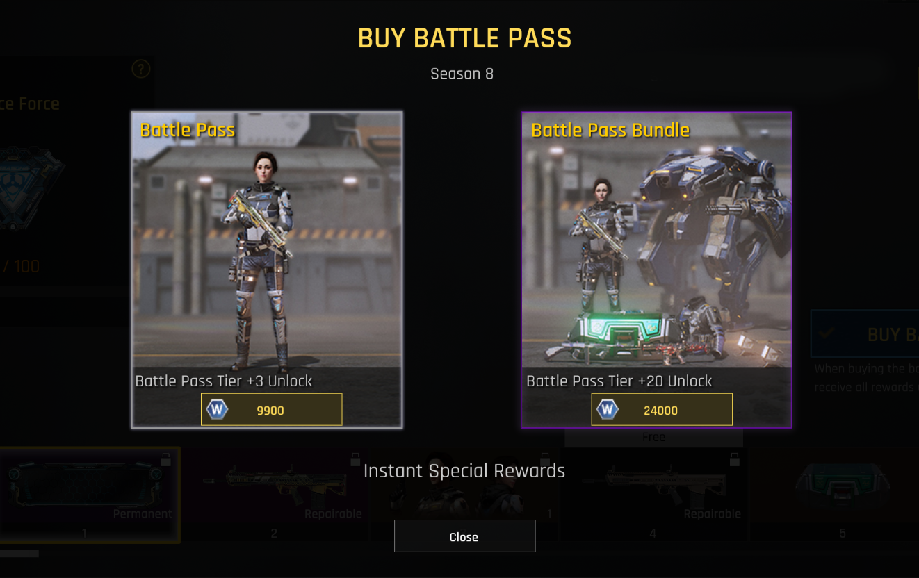 Q : How do I activate the Battle Pass??A : The free course of the Battle Pass will be automatically activated on all accounts. In order to activate the paid course, you will need to purchase the Battle Pass in-game with W Coins.Q : What is the difference between free tiers and paid tiers?A : The paid course provides rewards for all 100 tiers whereas the free course only provides rewards for select tiers. Q : If I purchase the Battle Pass, do I still receive the Free track rewards?A : Yes, if you purchase the Battle Pass you will receive the paid rewards as well as the free rewards. Q : What happens if I decide to buy the Battle Pass later?A : If you already made progress in the Battle Pass before deciding to buy it, all previous paid tier rewards will be unlocked instantly when you purchase the battle pass. Q : Is it possible to continue progressing in the Battle Pass after the season ends?A : No, the Battle Pass is only available for a limited time and once the season ends, the Battle Pass will no longer be active and the remaining rewards will no longer be obtainable.Q : Will I keep the Battle Pass items and be able to use them after the season ends?A : Yes, you will be able to keep and use all items that you have earned in the Battle Pass even after the season has concluded. Q : Are the items obtainable in the Battle Pass exclusive?A : Yes, all items are exclusive to the Battle Pass and cannot be obtained in any other way.Q : Are there any extra rewards available after obtaining all Battle Pass rewards?A : Once you have completed tier 100, there are no extra rewards available.Q : Do all skins in the Battle Pass come with a special reload animation?A : No. Special animations are only available for some skins. If you would like to check if a weapon comes with a special reload animation, please test it out using the gun-range.