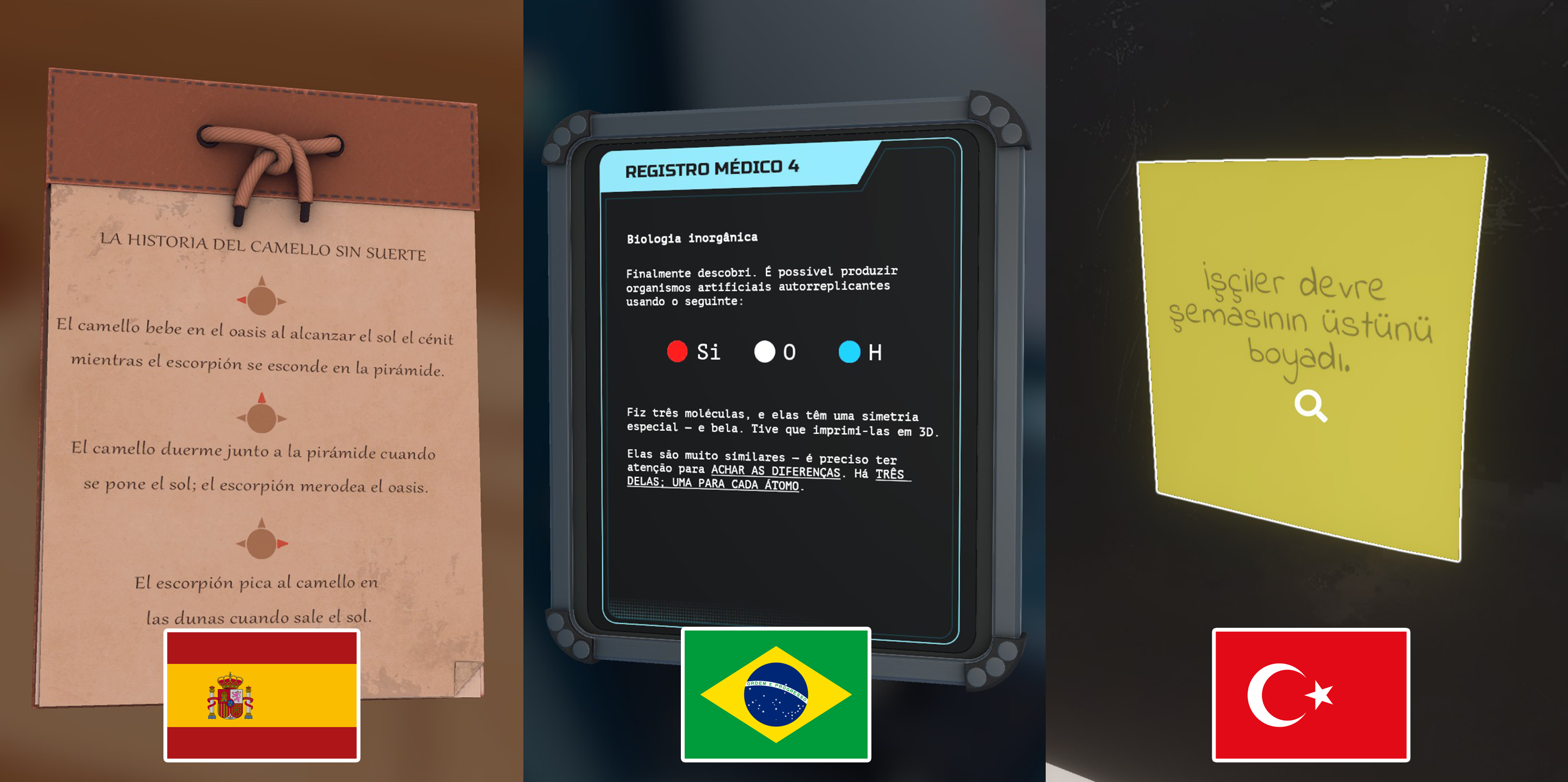 The time has come for another big Escape Simulator update! Today we will be adding no less than five language options to the game. Once this update goes live, you will be able to play the entire game in Türk (Turkish), Español (Spanish), Español (Spanish Latin America), Português (Portuguese) and Português (Portuguese Brasil)! We know that a lot of you have been waiting very patiently for this specific update, so we are very glad to reveal that the wait is finally over!
