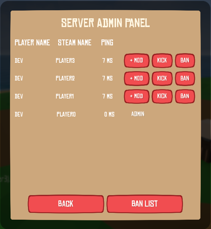As you might have noticed from the prototype screenshot, we’ve taken things a step further and set up the ability to grant trusted players moderator power. These players will be able to do everything except add/remove moderators.These changes are part of our effort to bring you dedicated server support (that Kindred leaked in a stream back in February). We can't promise you a date (Soon™️), but we can tell you it's important to us and we're actively working on it. Stay tuned for more updates!