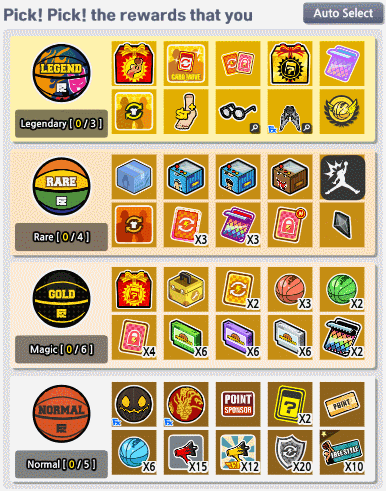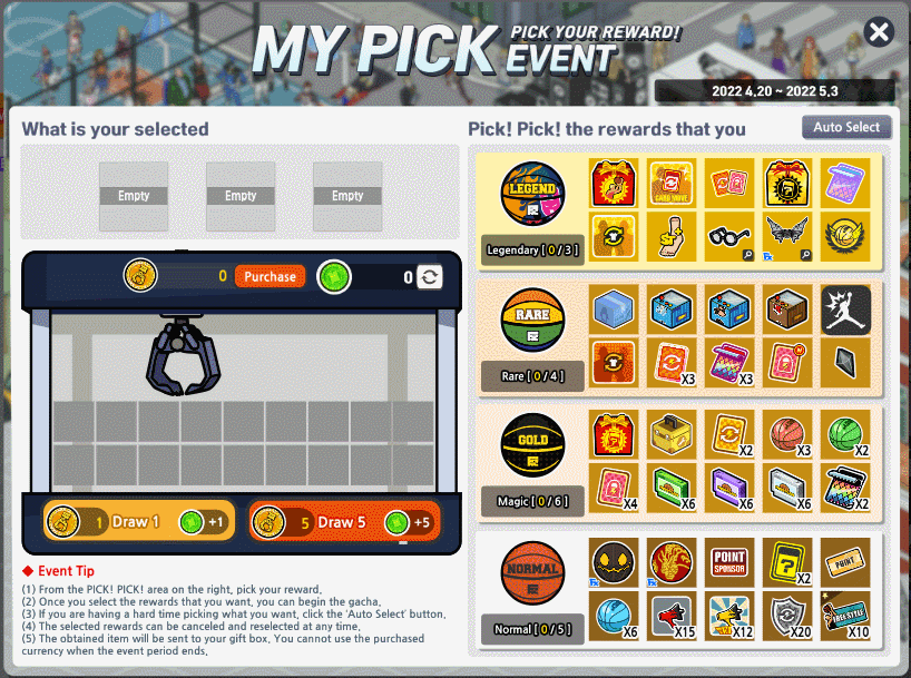 1. From the PICK! PICK! are on the right, pick you reward. 2. Once you select the rewards that you want, you can begin the gacha. 3. If you are having a hard time picking what you want, click the "Auto Select" 4. The selected rewards can be canceled and re-selected at anytime 5. The obtained items will be sent to your gift box. You cannot use the purchased currency when the event period ends.