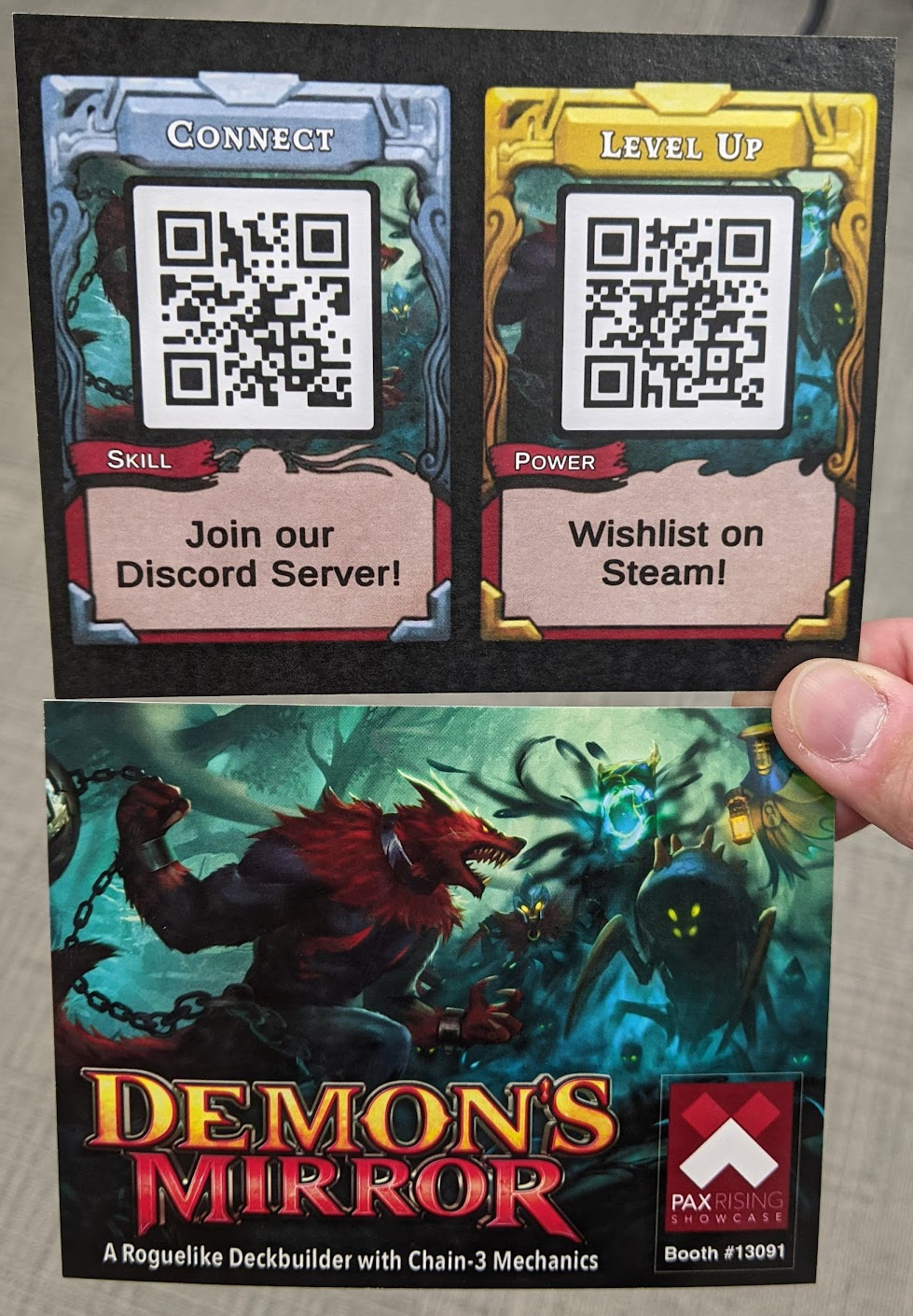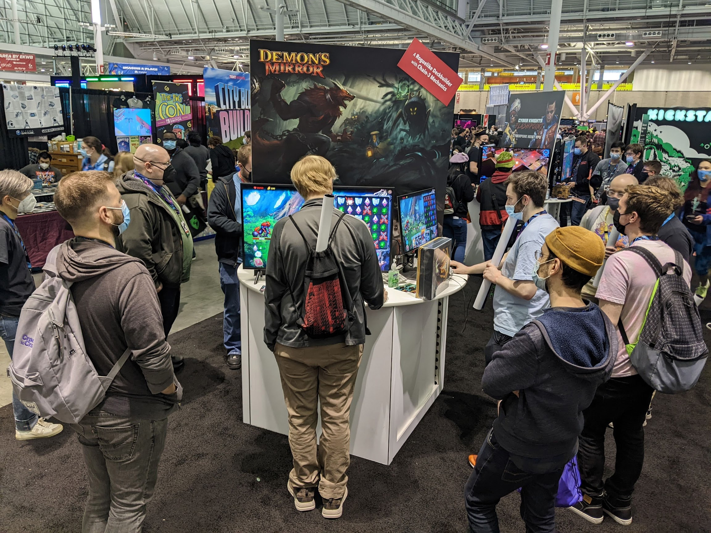 I just flew back from PAX East where Demon's Mirror was selected as a PAX Rising Showcase winner! Since we were a part of PAX Rising we were offered free booth space at PAX East, and the game was playable for the first time by the public, ever!