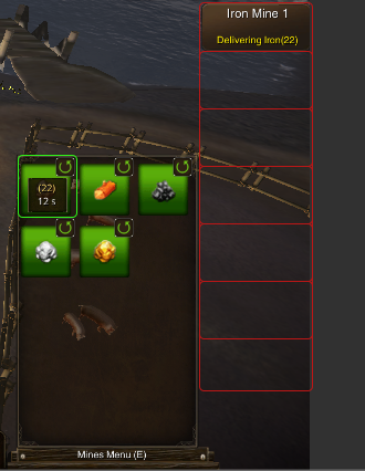 With that being said, I had to rework mines as there will be 5 new sources orderable from 'Royal farm' due to tailor. And I know that lot of players complained about it since it was a bit confusing and late game not helpful. So here is the change, where red brackets showes removal of the old HUD. It may have been graphically nice, but it consumed about 5-10 fps during late game, so it's a big no. The new, green highlighted parts are icons of materials. After ordering them, it will just show quantity and display countdown delivery. Yes, ordering will be done the same way as at marketplace. For now the limit will be up to 100 materials per oder. You can set it on repeat, which will repeat the same order after it's finished.
