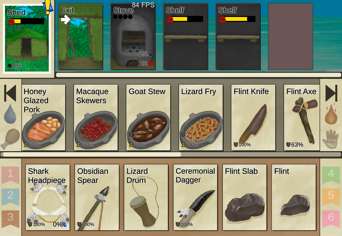 A new cheaper alternative to the mud hut. It is built mostly with woven palm fronds so it can be built earlier in the game with less of an investment. Be warned however that this structure has considerably less space than the mud hut and does not have all of its improvements. So the mud hut is still much better for permanent homes, the shed being instead ideal for outposts and temporary bases.
