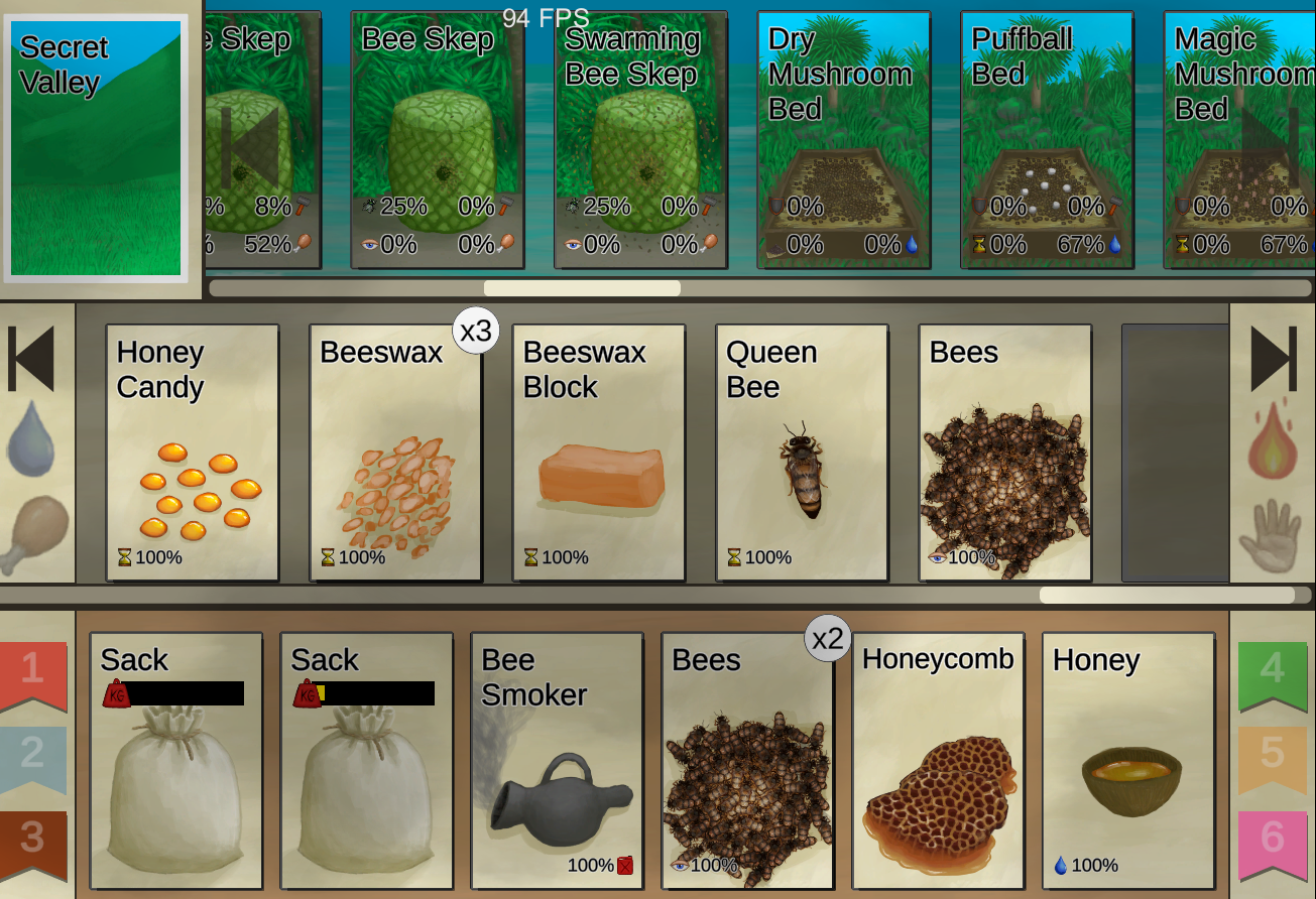 With a queen, some bees, a honeycomb and some other things you can now build bee skeps. These artificial hives need to be fed sugar water to help them grow and will produce more honey the more flowers you have in the area. Skeps will also start swarming once new queens are ready, an opportunity that can be used to build new skeps by capturing the surplus of bees.