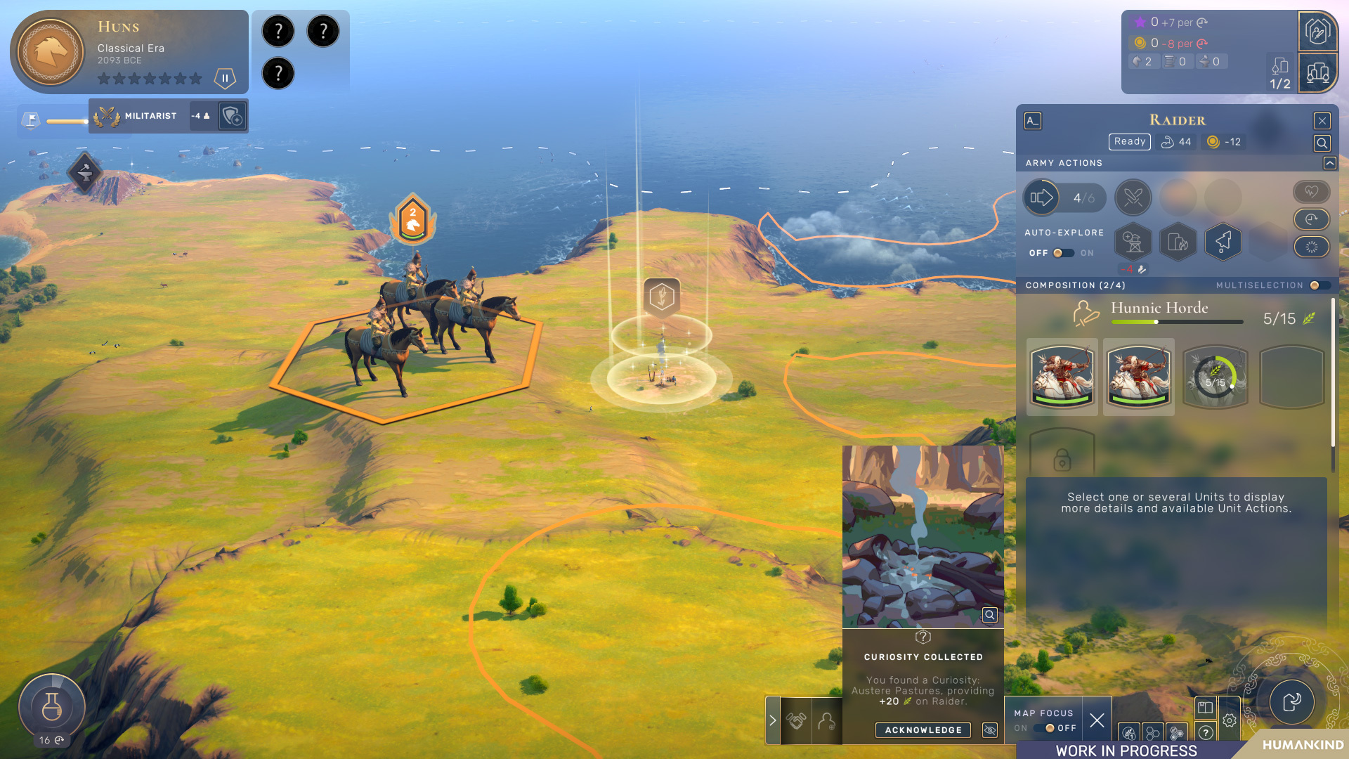 On their own, their emblematic units were in a good spot in combat; difficult to catch but not overly powerful in a fight. Their tendency to multiply and raise new troops after killing yours caused some problems, though. You might enjoy fending off a couple of horse archers the first time around, but weathering an endless horde of them in a large battle or prolonged war could be tedious, if not frustrating. So, we've reined in these seemingly necromantic practices: Mounted Nomads will no longer grow from defeating enemy units. Instead, you can find special "Pasture" curiosities that will provide some growth to your army, and you can still grow by pillaging enemy districts.