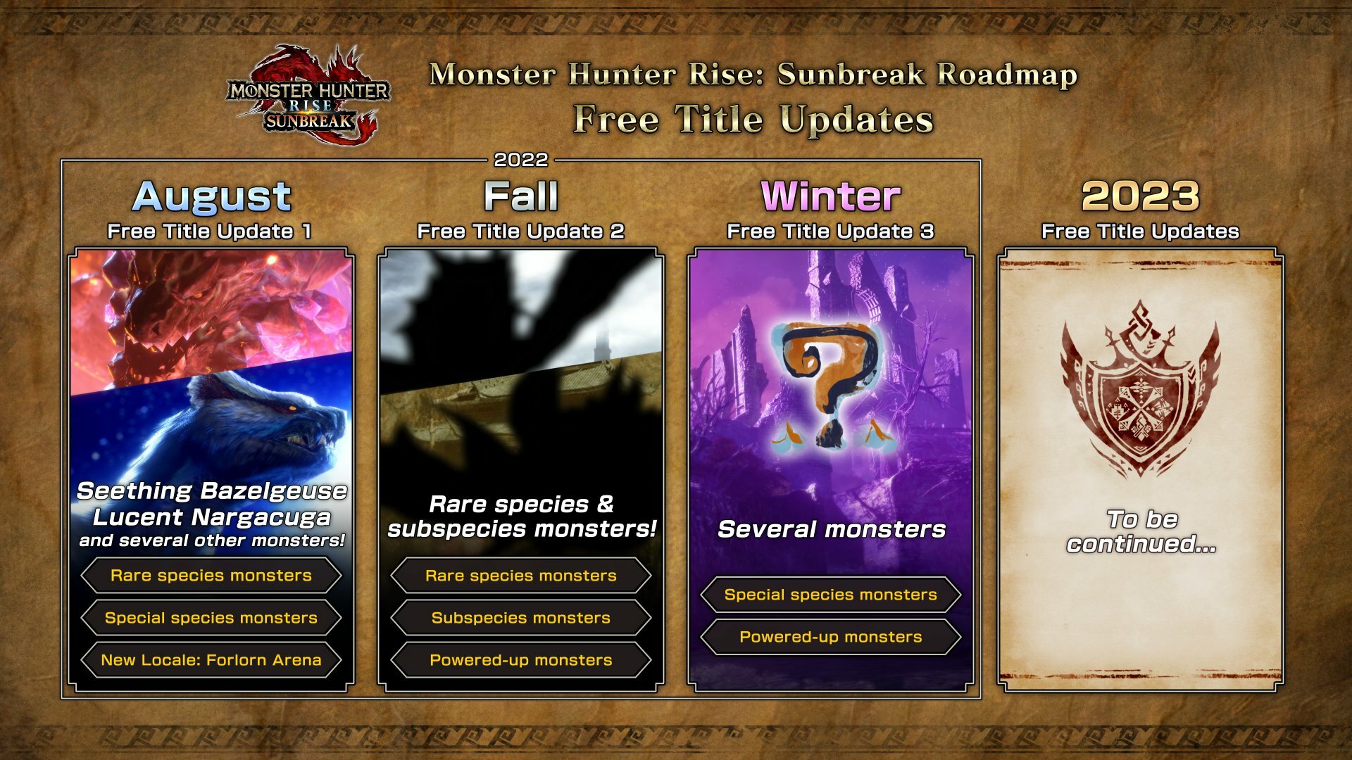 As mentioned earlier, your adventures in Sunbreak have only just begun! The team are keenly working on a number of free Title Updates, starting this August, that will add even more exciting content to the game.