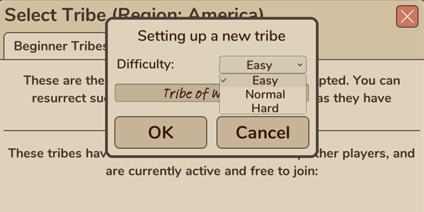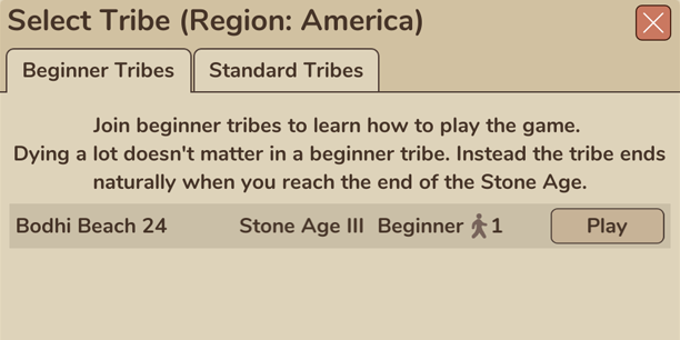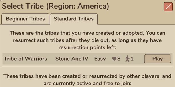 Standard tribes will be started and named by you players. They will go online when players are active on them, and will go offline when no-one is playing on them. When a player activates a tribe it will become visible for other players to join also. The tribes can be resurrected from offline (dead) status several times, but not infinitely. Each player can only resurrect a limited number of tribes.