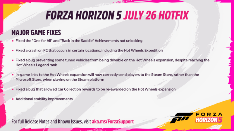 We're constantly working to improve the experience in Forza Horizon 5. Below you will find a summary of items fixed or improved upon in this update.
