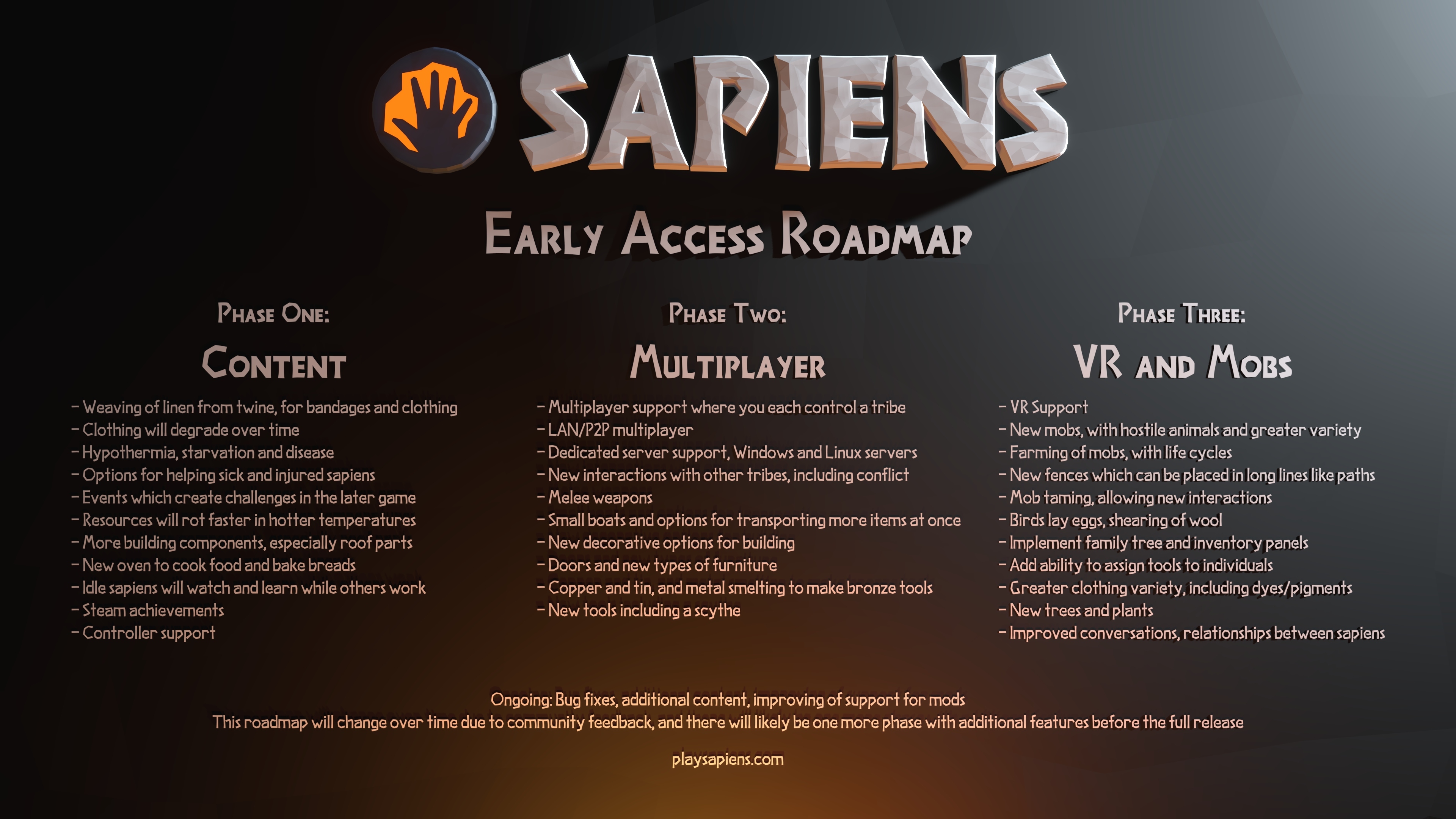This Early Access release is only the beginning. The above shows you some ideas of what’s next in terms of content and features. As I will be taking on board community feedback and suggestions, the roadmap isn’t set in stone and the order may change, but it should give you a good general idea of Sapiens moving forward.
