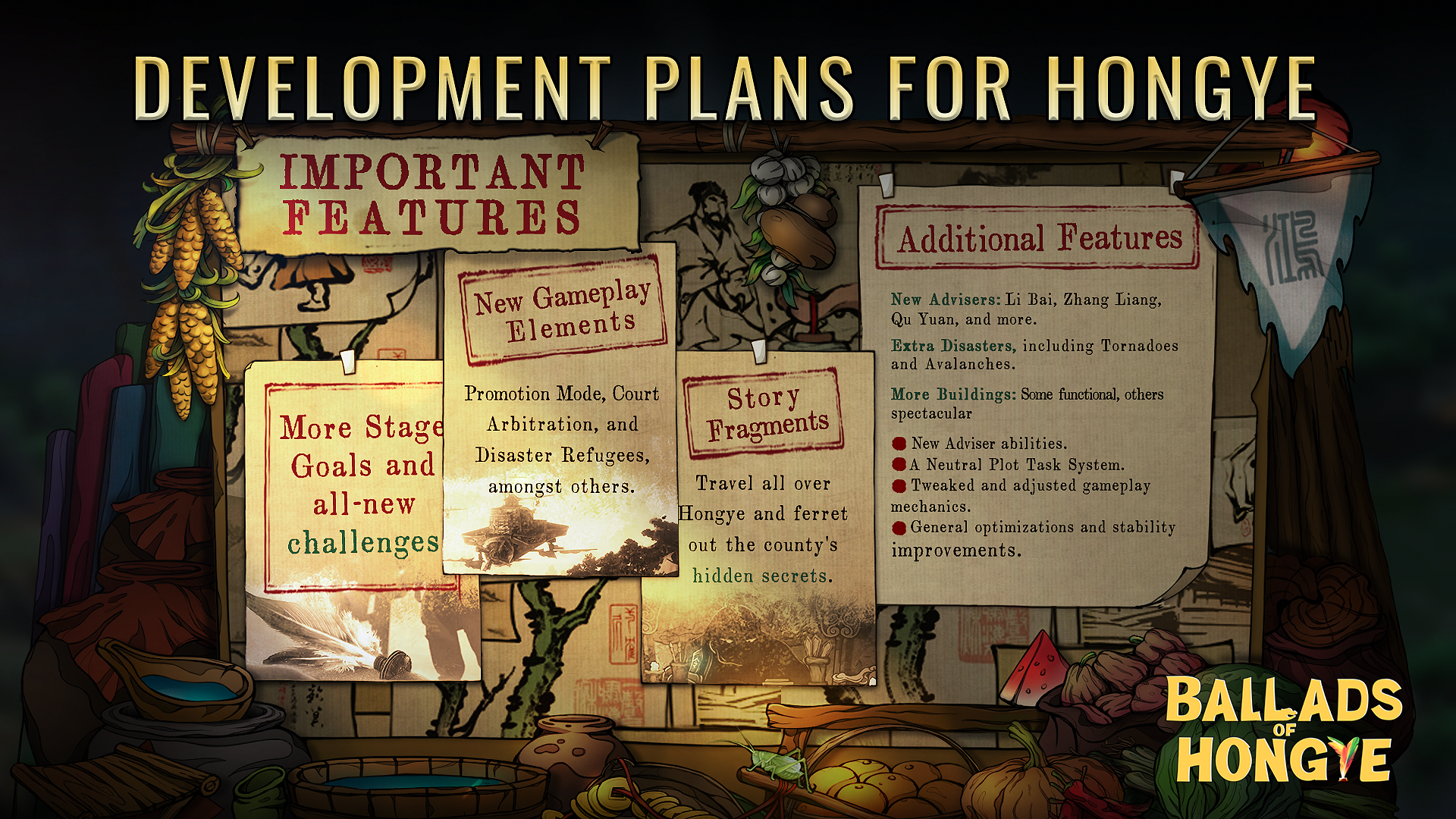 -New advisers: Make your own cabinet of famous advisers to perfect your rule. The new famous advisers include but not limited to: Li Bai, the famous poet who is bold enough to refuse the emperor, or Mr. Wolong who is never afraid to take up responsibility. You may find famous and historical characters all over Hongye. Sometimes you will chase them, sometimes they will chase you and offer their services. Peasants might be content with peace alone but malevolent forces are always at work, so you have to pay attention to your relationship with advisers, managing their salary and happiness levels. They might become your guardian angels, help you mitigate the impact of scandalous events, or your harbingers of doom, by suing and taking you to court and ruining your reputation and disputing your claims.