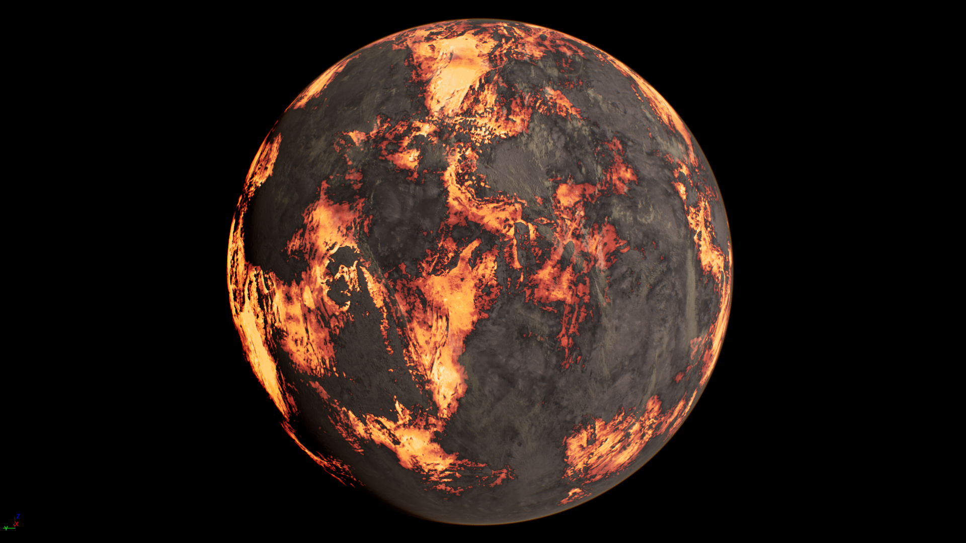 The landscape shader takes the relative height of the lava into account when defining its regions, and I'll be driving that value using the planet's kelvin temperature on the procedural generation. Here's what it looks like when you turn up the temperature on the same planet :)