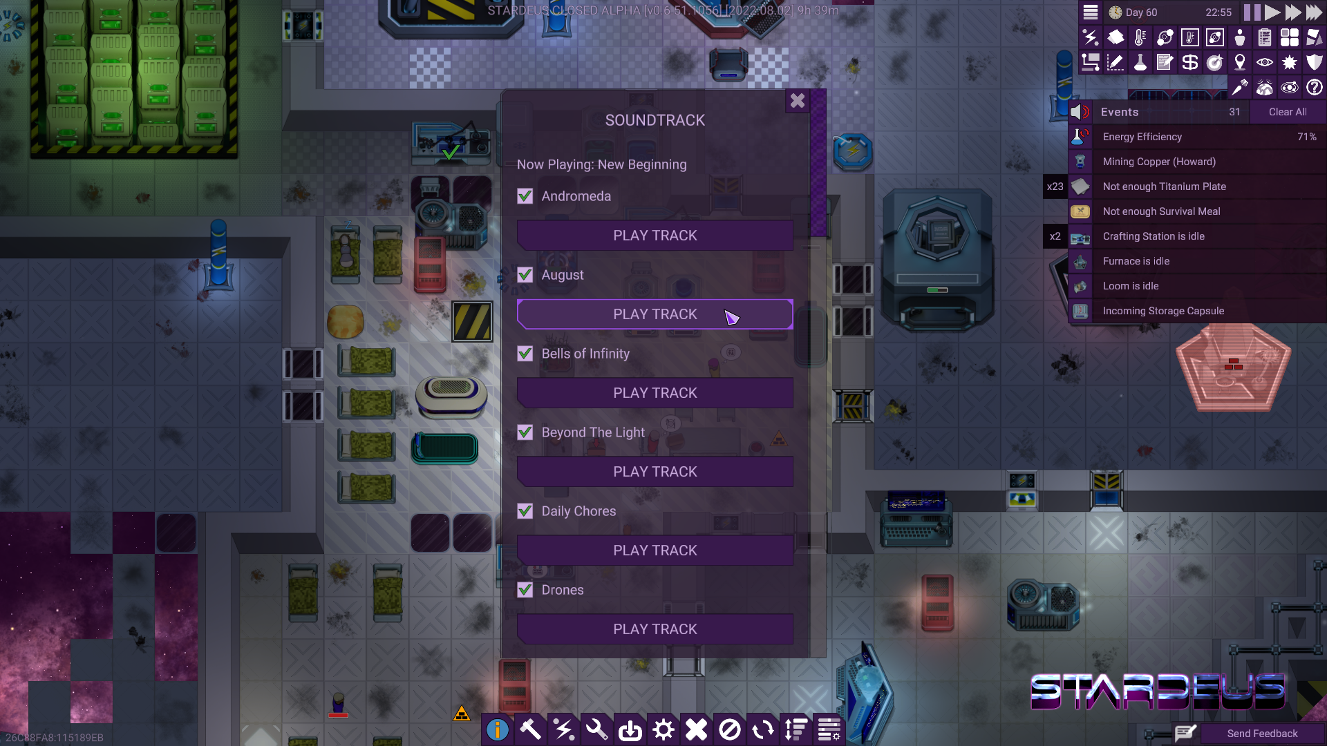 Stardeus OST currently contains 27 tracks, and more will be added! There is now a menu section dedicated to the soundtrack, where you can listen to each track, and select the ones youâd like to hear. The UI for it isnât necessarily final, so it may see updates in the future!
