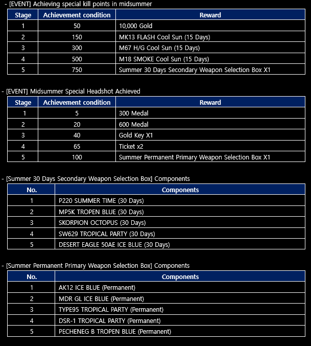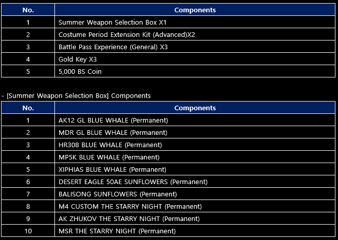 ▶ Special package sale to commemorate the midsummer big event - Event period: After maintenance on August 4th ~ Before maintenance on August 18th - Price: 7,725 Bullets (3,999 Bullets) / Up to 2 purchases - [Package components]