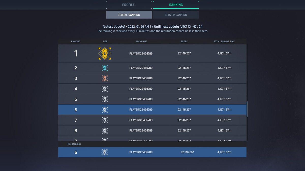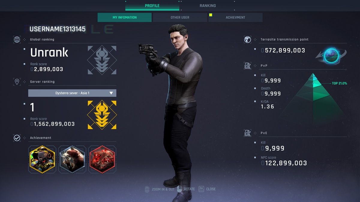 In addition to the Global ranking leaderboard, the profile menu will provide more detailed information such as rankings, scores, achievements, terrasite transfer points, and PVP/PVE stats.