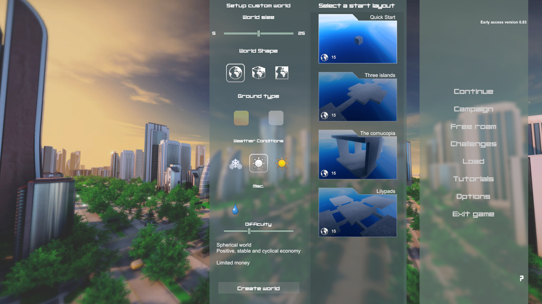 0.82 -> 0.83 - Changed template selection in main menu, selecting a template no longer starts the game at normal difficulty. Instead you can adapt the settings freely and start the game using the specified template (which makes more sense :)). - Economic crashes no longer occur on easy mode. Instead, economy fluctuates smoothly. - Added text box to describe the differences between the difficulty modes. Localizations will be added in later. - Easy modes now has an increase likelihood of conglomerates making offers. - Updated one of the templates to avoid size issues when starting a template on a minimum sized world - Changed texture mipmap settings to avoid buildings looking overly dark at a distance. - Adjusted the camera startlocation depending on world size - Added a display size of area placed when placing blocks and also road length. - Added 1x1 tradition ideology decoration.