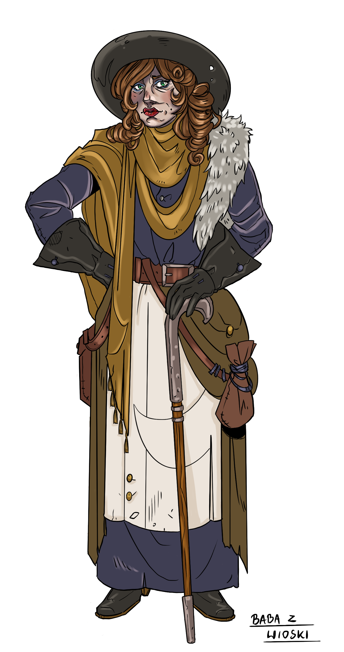 Our artists describe it something like this: " Polite woman from the village. Nobody knows what she do, but she always have money. Recently she buried her fourth husband :) " Have some bussiness with her? Better watch out ;)