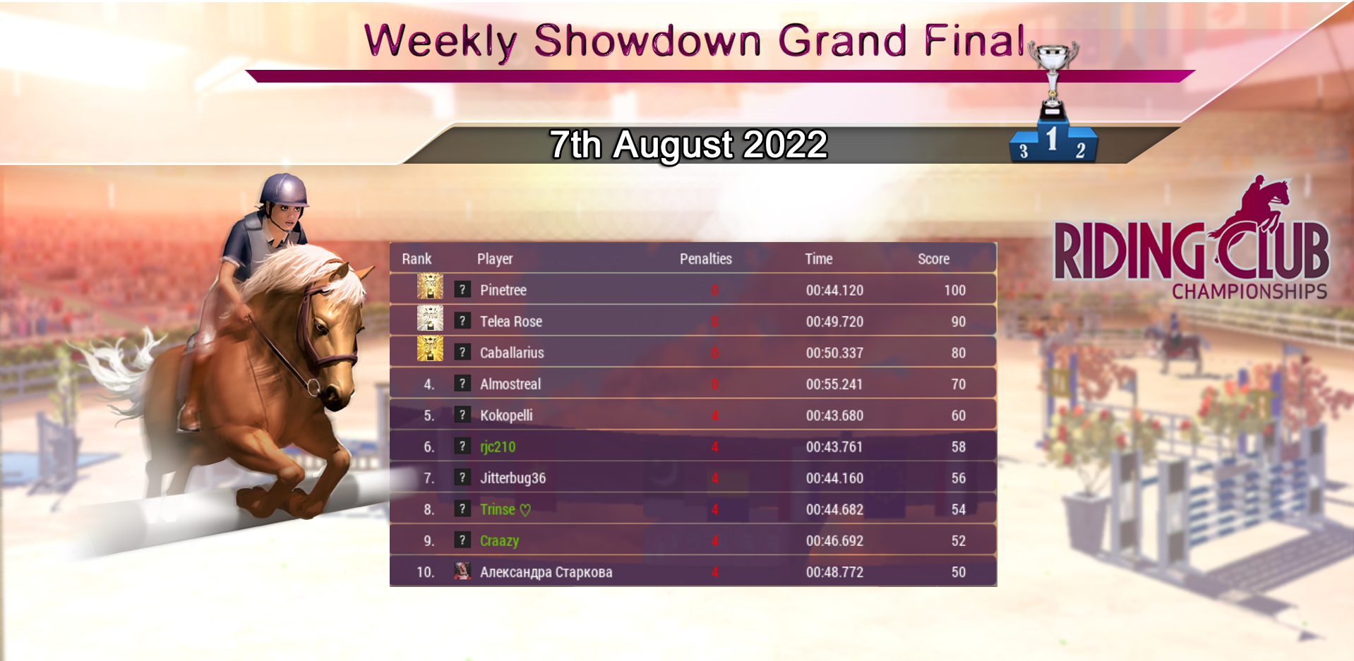 Huge congratulations to our Weekly Showdown Grand Final Winner, Pinetree who wins with an incredibly fast round! Our course this week produced another competitive Grand Final with just 4 riders going clear. Congratulations to everyone who made it through and did so well :)