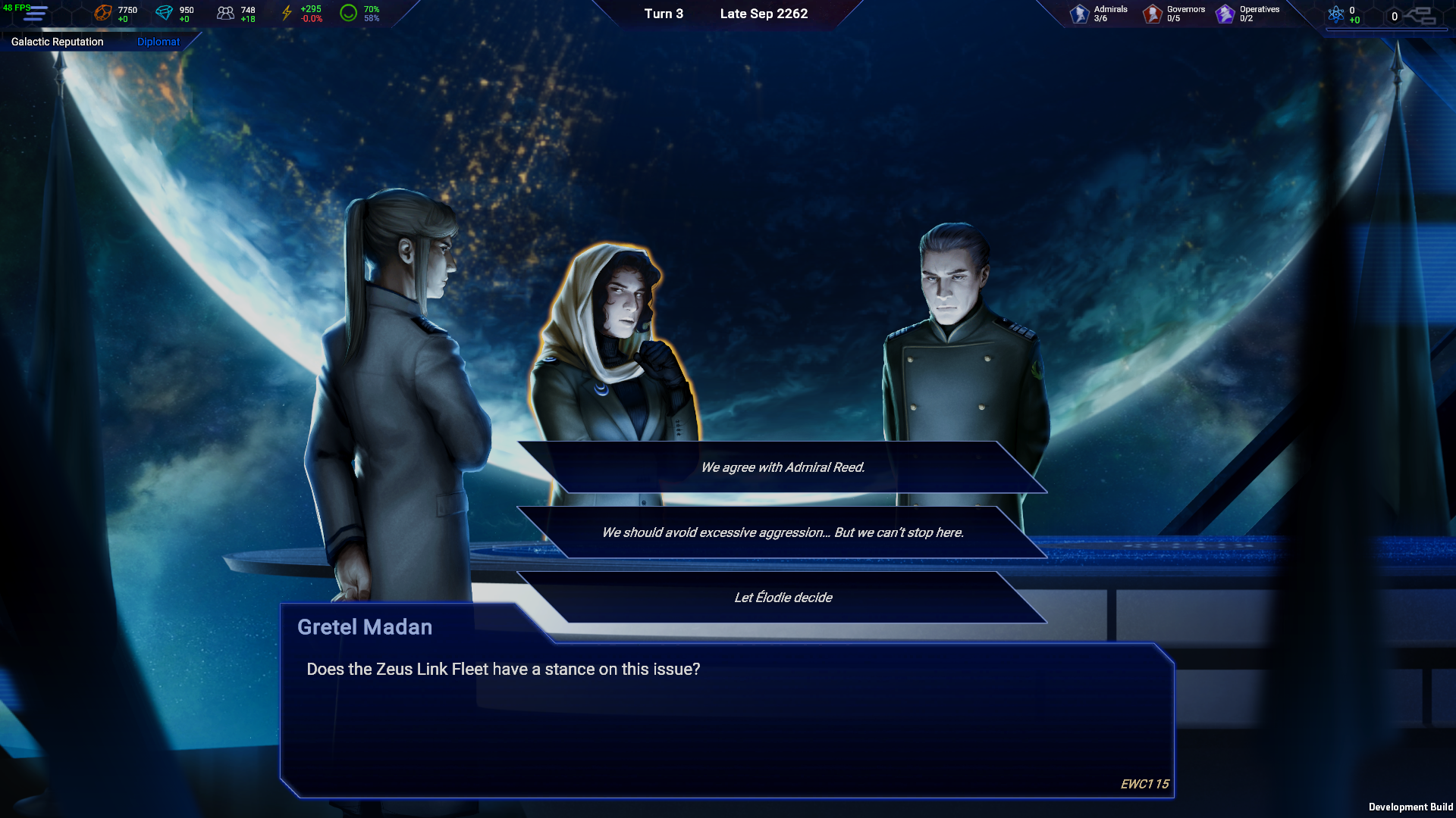 In addition, you may set your diplomatic approach from a set of three options: diplomatic, pressuring or threatening. Each tone of negotiations can yield different results, but pressuring or outright threatening another faction might well damage your relations with them. When planning your diplomatic deals and choosing your approach to the negotiations at hand, you’ll see an estimation of the reaction your experts are expecting to see from the receiving party, which determines the expected possibility of success for your offer.