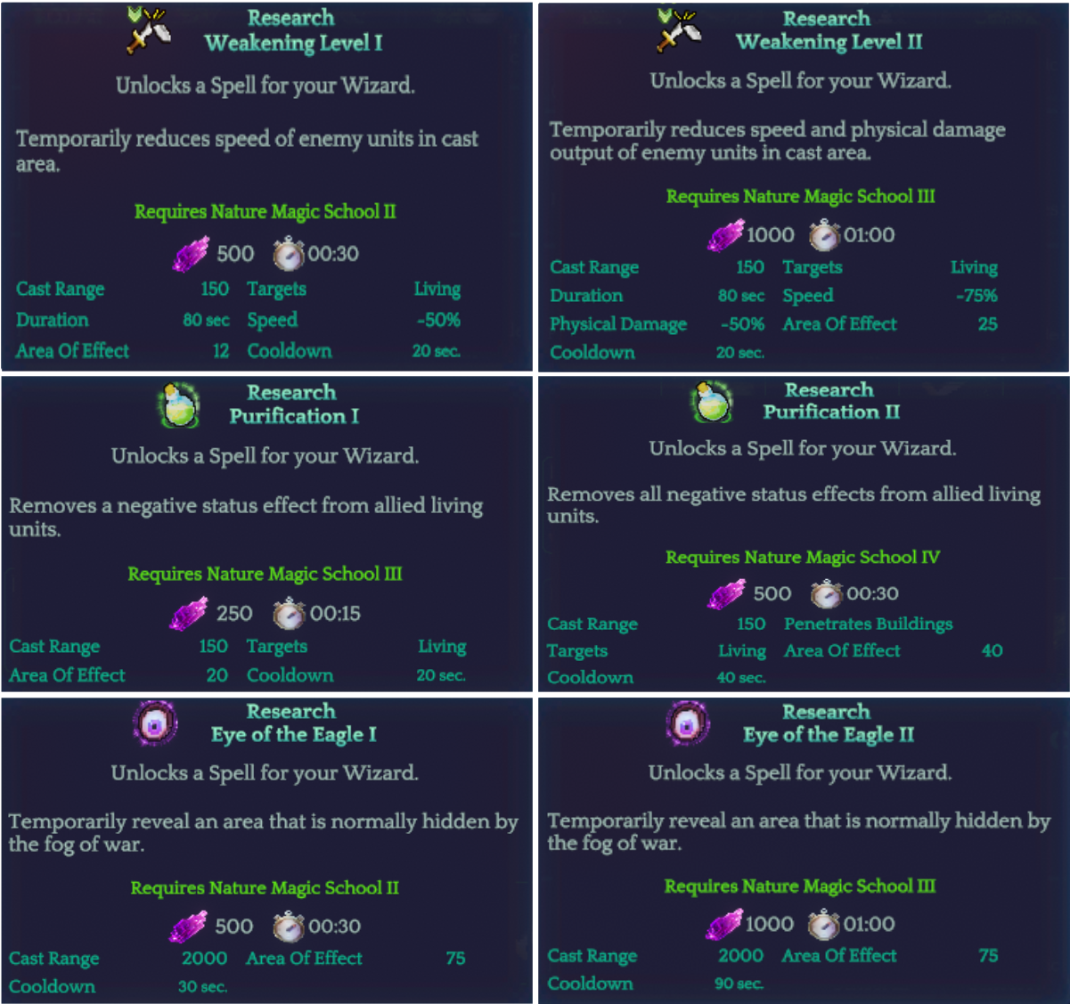 The magic schools are also a gating mechanism, comparable to the Ages in "Age of Empires". The higher your magic school, the more research, buildings, and spells are unlocked. You can use some research options only when mastering certain magic school levels.