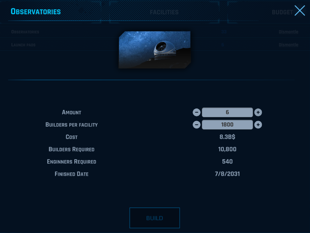In order to improve your space agency players will need to build and upgrade facilities such as Observatories, Launch pads and Satellites, also every space mission requires Astronauts so players will need to invest in Astronaut training to produce more Astronauts to launch more missions simultaneously.