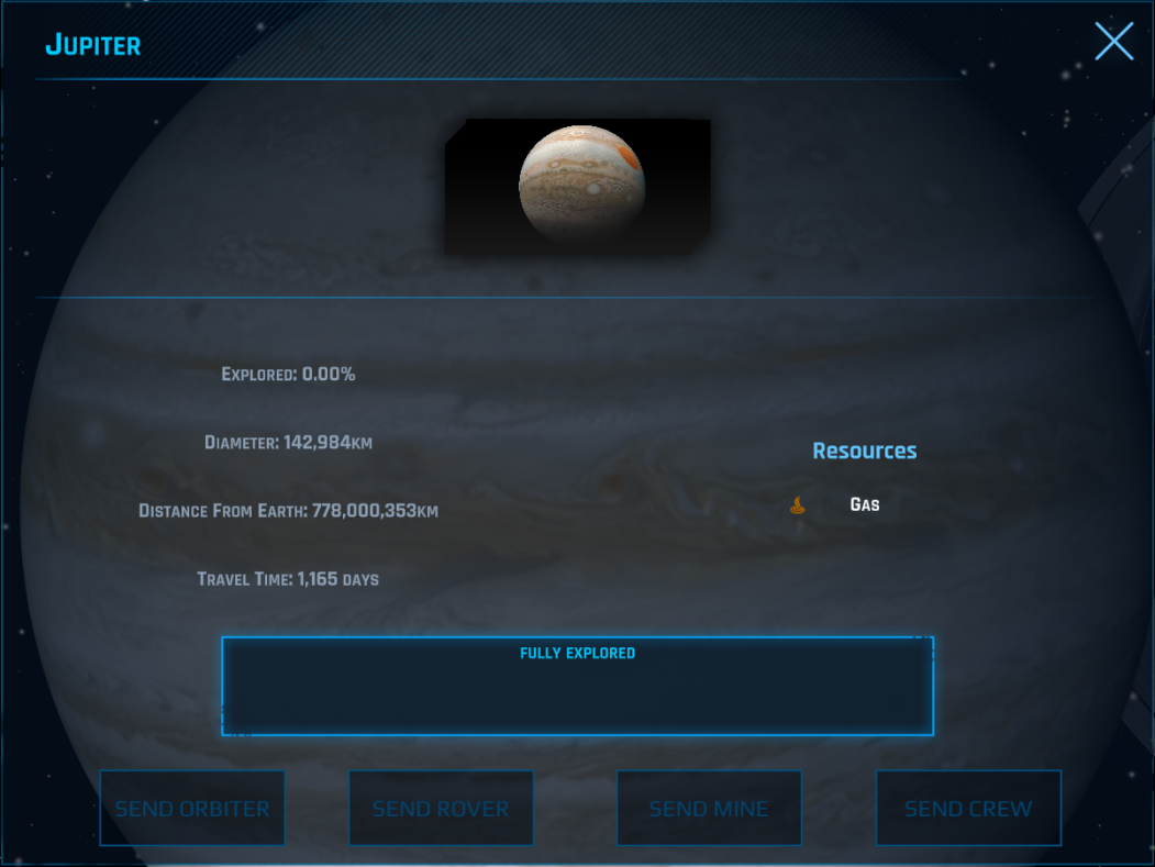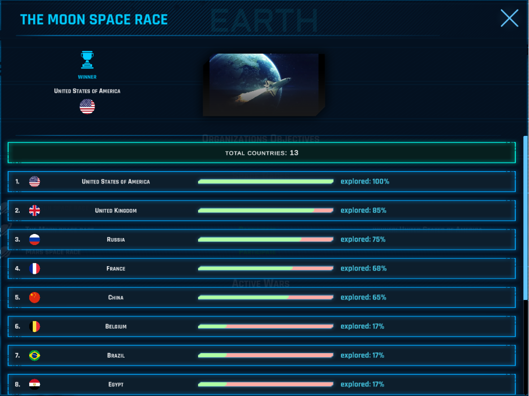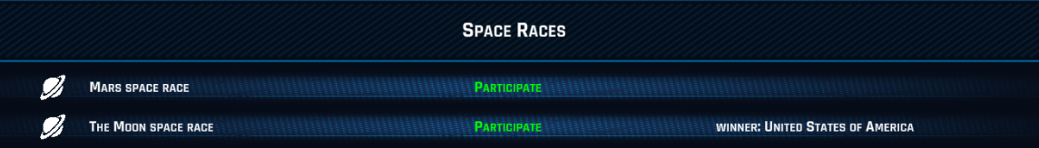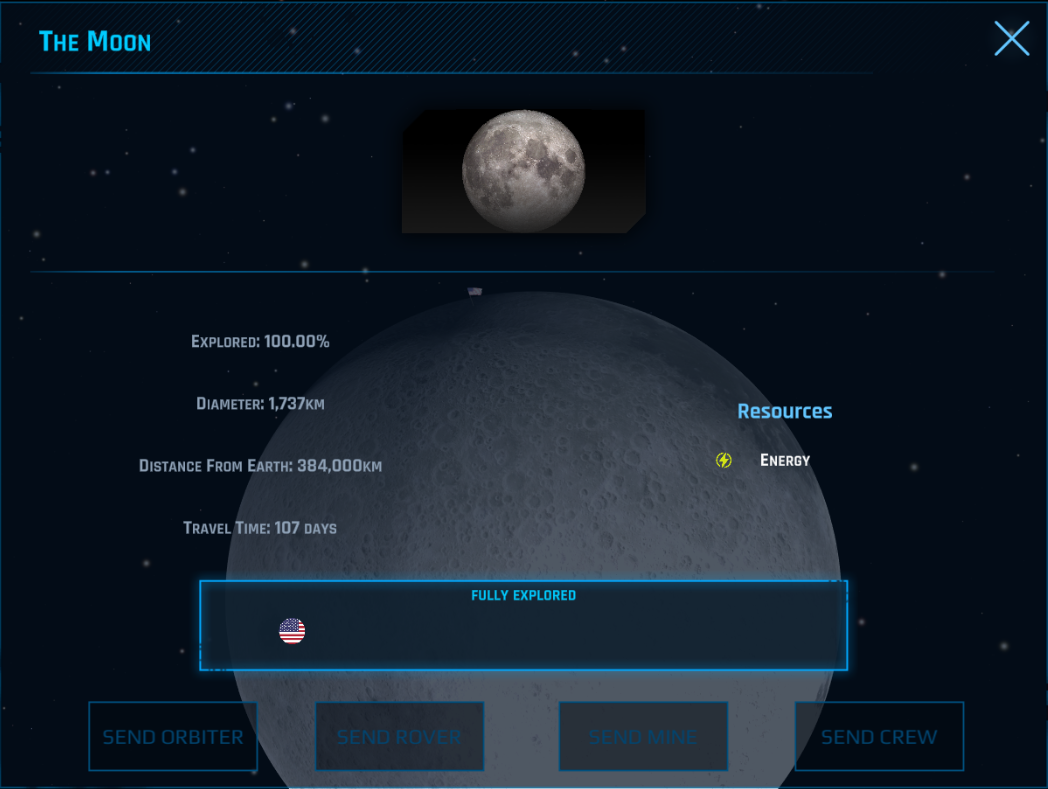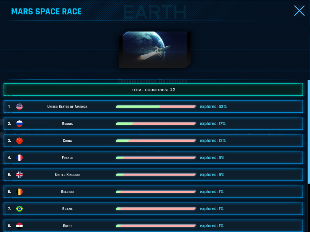 Crewed missions must be sent to a planet to reach 100% exploration rate. The first countries that reached 100% exploration rate of a planet will gain world influence and space technologies breakthroughs, and the first country will win the planet space race.